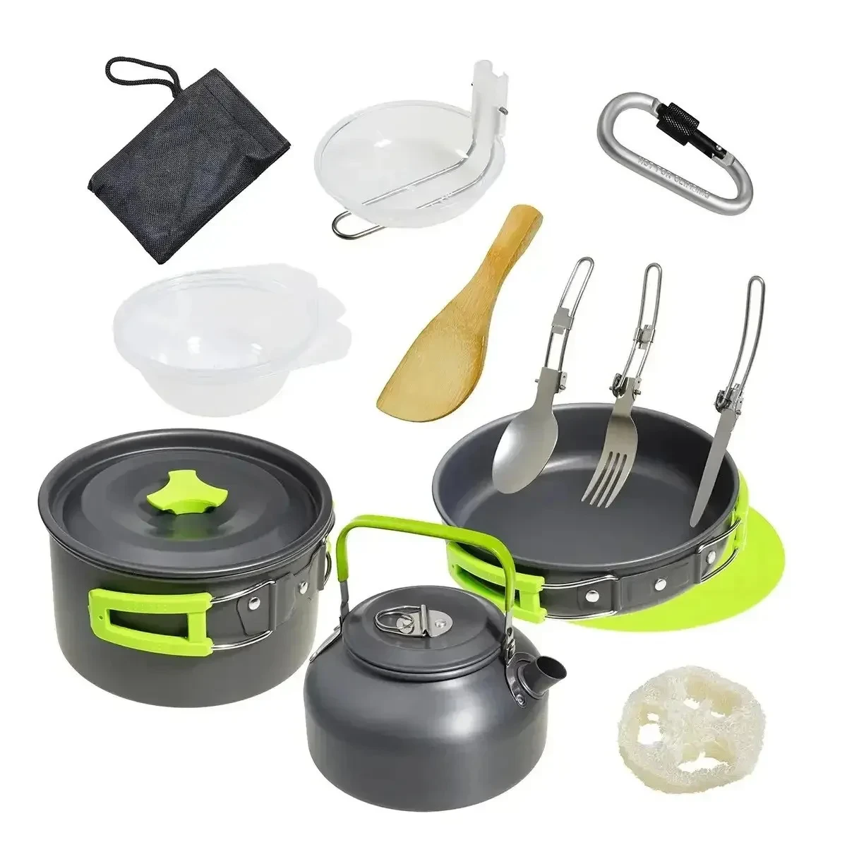 - Комплектация: Чайник, кастрюля, сковородка, крышка диаметром 8,5 см, крышка диаметром 17,3 см, миски – 3 шт., половник, разделочная доска, деревянная лопатка, набор столовых приборов (вилка, ложка, нож) в тканевом чехле, губка, карабин, сетчатый чехол